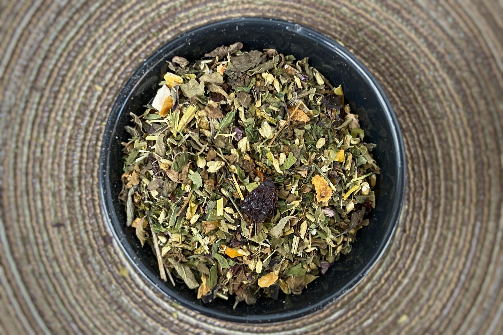 Ingredients: Tulsi, rose hip, orange peel, yarrow flower, passionflower, scullcap, peppermint