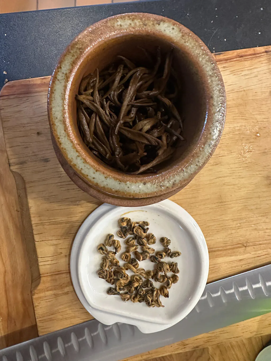 A rich, smooth Chinese black tea with a profile reminiscent of roasted sweet potato, honey and topsoil. This rolled leaf is said to look like little snails, and as the tea infuses, the tiny snails poke their heads out! Brew over and over, up to 15 infusions easily per serving! One of our top sellers, and a truly exquisite example of the gorgeous quality being produced by our partners, the Lin family farm in Anxi, Fujian.